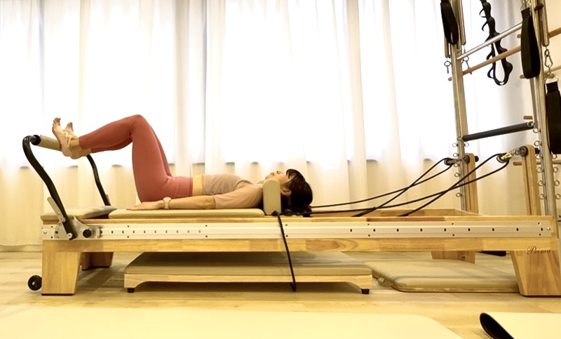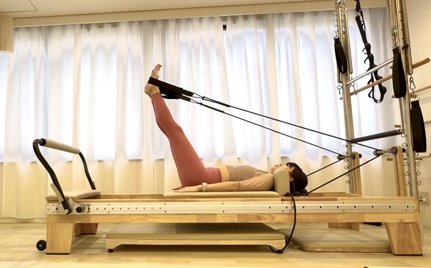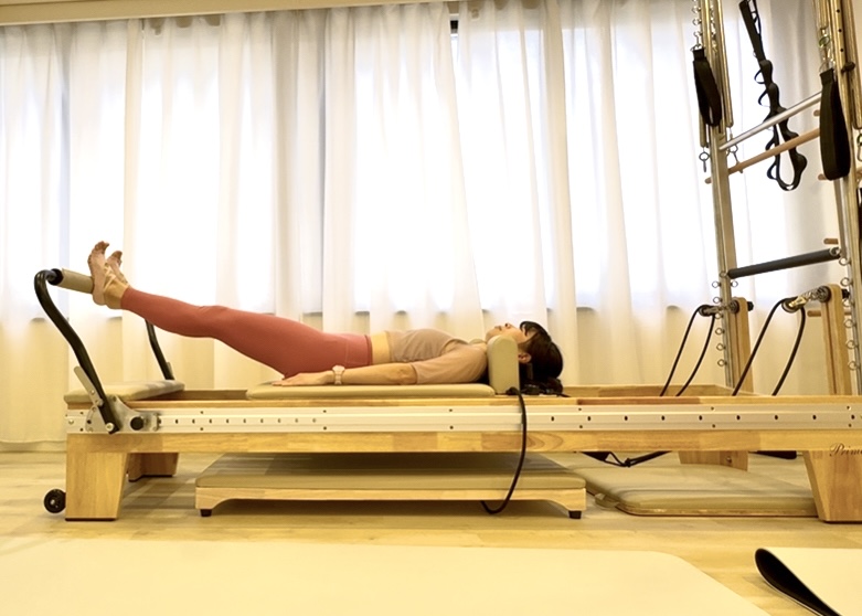 - やり方:リフォーマーのキャリッジに仰向けになり、フットバーを使って足を押し出す