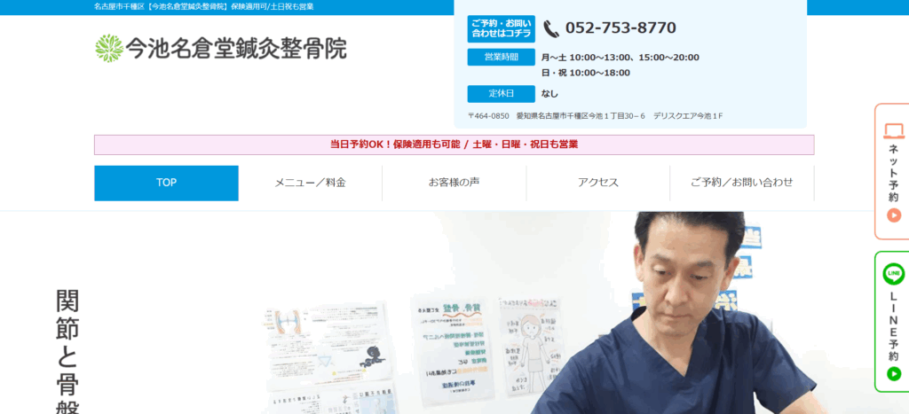 名古屋市千種区今池にある「今池名倉堂鍼灸整骨院」は、今池駅徒歩1分の通いやすい立地にある関節・骨盤専門の接骨院です。