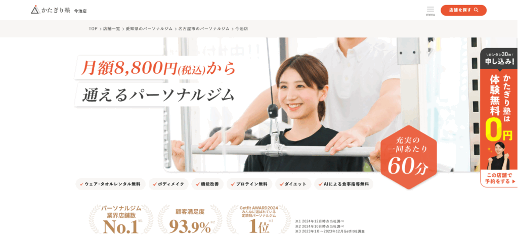 「かたぎり塾」は、全国300店舗以上を展開する完全個室のパーソナルジムです。