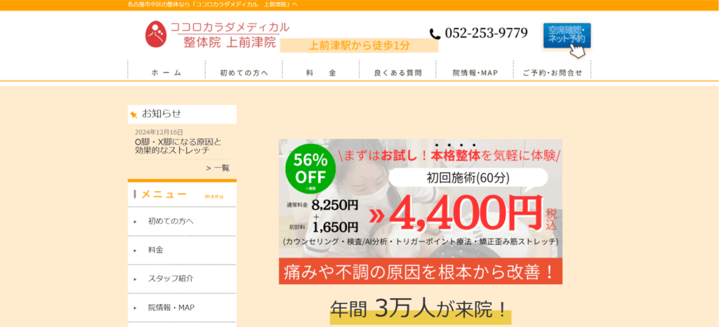 「ココロカラダメディカル上前津院」は、上前津駅徒歩1分にある整体・接骨院グループの一院で、全国トップクラスの来院数と口コミ評価が強みです。